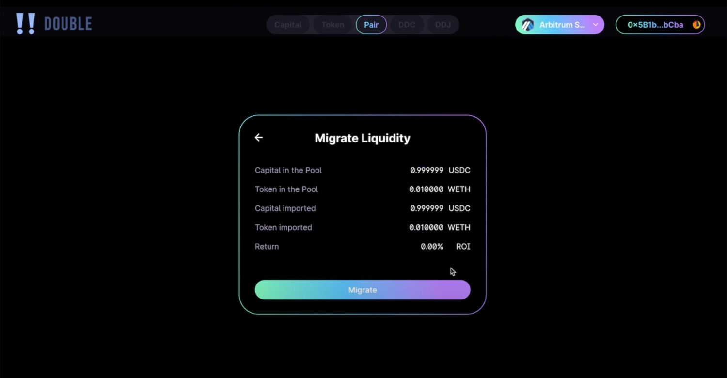 Liquidity providers with LP positions in an AMM can migrate their liquidity to the Double protocol and earn DDJ Tokens. Positions are restricted to containing at least one capital type preselected inside the protocol (DAI, USDC, USDT, or WETH, WBTC)